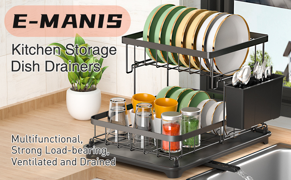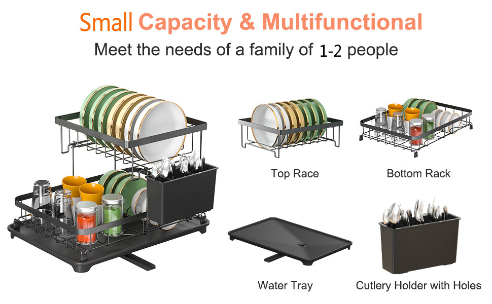 Small Capacity:This is dish drainer rack is suitable for kitchens with limited space. Measures only 34 x 22 x 26 cm.With a providing for storing tableware such as dishes, plates, bowls, mugs.This dish rack is only suitable for flat dwellers or couples with compact kitchens. Efficient and Space-Saving:Our improved design optimizes the use of space. It curtails storage space needs by half and setup time by 100%. This implies that you can access your dish rack fast and efficiently, advancing your kitchen's practicality. Auto-draining Drainboard:The dish drying rack includes central drainage holes and a swivel spout, making sure the water flows directly into the sink, so you can put the rack next to the sink in the best position for your needs, and have it work. Rustproof and Sturdy:The Dish Drying Rack is made of premium carbon steel with black powder finished. Corrosion Resistant and Rust Resistant are ideal for kitchen and food applications. the sturdy construction will provide a strong load-bearing to storing all your kitchenware easily.